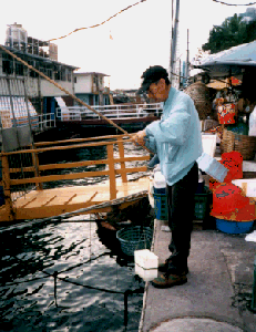 今日行經香港仔避風塘,見一老叟右手提著一白膠桶,左手拎著七尺長,在岸邊像找甚麼似的.在好奇心驅使下,上前看過究竟,只見他小心地放繩,將那小白膠桶吊到十呎下的牆邊,跟著他用純熟腳步,配合腰馬,向下一掃一掃如橫行蟹一樣動作.轉眼間已有半桶肥大的水蟑螂被捋被捕,果然是捉水蟑螂專家.