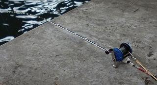成 Set 竿最貴既部份,可以講係話個橫絞仔,佢既價值係支竿既三、四倍,都值幾十蚊咖 ! 嘿~~嘿~~! 所以要搵條失手繩扣實個橫絞仔以防萬一 (如圖示),夠晒盞鬼兼騎哩。 騎哩筏面世後因長度所限,很難找到合適的釣場使用,真是苦無用武之地。 直至上星期六 (27/05),le'Dan 同青蛙兩條友仔上左東廊低,先初嘗中魚滋味。