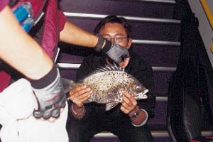 睇一睇隻錶,已經八點半,乜流都冇晒,周圍既空氣簡直靜止晒一樣,心諗都係快打晒半袋誘餌,洗袋收工走人。於是就用小齊教我既「筒子打誘餌法」,三筒打法冇效呀? 用夠九筒打法啦! 突然見到浮波半沉於水中,初頭以為誘餌打沉個浮波,等多陣瑩光都消失埋,唔通真係打得太多誘餌?? 我竿一抽,中呀! 嘿~嘿~! 手板黃腳立即上水! 於是我用五筒打法再打,再中。魚訊明顯比前一口快同爽左好多,浮波一下沉就不見左。哈哈,心諗可能有群黃腳來探我。當再放第三次餌,浮波一到水,唔夠十秒就消失得無影無蹤。竿一揮,又中。第四口,都黎唔切打誘餌,再中。其後,中完再中,由於實在太搶口,所以沒有走口斷線,一口氣釣左唔知幾多條,只知身邊的大誘餌袋有很多黃腳活在不多的水中。哈哈真是過足手癮。 果陣已經九點, 魚訊也突然沒有了。點解誘餌仲有咁多?? 原來當我釣到第四條黃腳時,在打誘餌之前又中魚,所以都冇乜點打過。於是見時間無多就盡快將剩番既誘餌用不停既打法,務求快打完了事。 突然見浮波又一沉,唔通仲有黃腳?? 但我一抽竿,我已經有答案。拉力比先前大左好多,條魚向水底猛衝,我即刻扮下高手,右手頂魚,左手繼續打下誘餌,最後條魚都上到水面。但我之前都提過釣位同水面有18尺的距離,撈魚的確有好大困難,最後只好跪在地上,右手舉竿,左手撈魚,撈兩、三次先上到水,果然係條斤頭牛屎,今次無死喇! 大魚到呀!